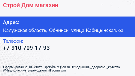 Строй Дом, магазин по адресу Калужская область, Обнинск, улица Кабицынская, 6а в дальнейшем Организация, размещена в следующих категориях: