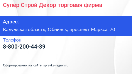 Супер Строй Декор, торговая фирма по адресу Калужская область, Обнинск, проспект Маркса, 70 в дальнейшем Организация, размещена в следующих категориях: