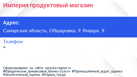 Империя, продуктовый магазин по адресу Самарская область, Обшаровка, 9 Января, 9 в дальнейшем Организация, размещена в следующих категориях: