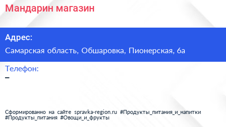 Мандарин, магазин по адресу Самарская область, Обшаровка, Пионерская, 6а в дальнейшем Организация, размещена в следующих категориях: