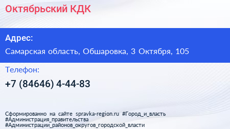 Октябрьский КДК по адресу Самарская область, Обшаровка, 3 Октября, 105 в дальнейшем Организация, размещена в следующих категориях: