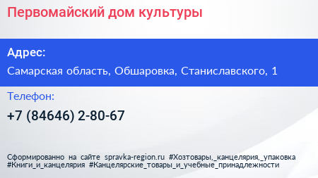 Первомайский, дом культуры по адресу Самарская область, Обшаровка, Станиславского, 1 в дальнейшем Организация, размещена в следующих категориях: