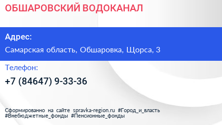 ОБШАРОВСКИЙ ВОДОКАНАЛ по адресу Самарская область, Обшаровка, Щорса, 3 в дальнейшем Организация, размещена в следующих категориях:
