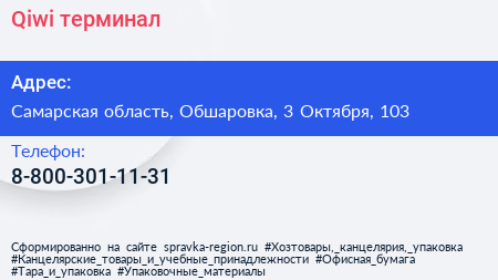 Qiwi, терминал по адресу Самарская область, Обшаровка, 3 Октября, 103 в дальнейшем Организация, размещена в следующих категориях: