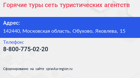 Горячие туры, сеть туристических агентств по адресу 142440, Московская область, Обухово, Яковлева, 15 в дальнейшем Организация, размещена в следующих категориях: