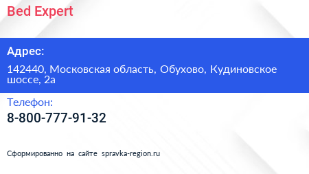 Bed. Expert по адресу 142440, Московская область, Обухово, Кудиновское шоссе, 2а в дальнейшем Организация, размещена в следующих категориях: