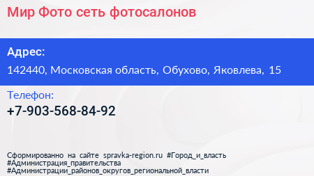 Мир Фото, сеть фотосалонов по адресу 142440, Московская область, Обухово, Яковлева, 15 в дальнейшем Организация, размещена в следующих категориях:
