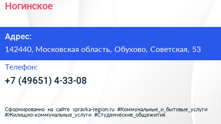 Ногинское по адресу 142440, Московская область, Обухово, Советская, 53 в дальнейшем Организация, размещена в следующих категориях: