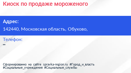Киоск по продаже мороженого по адресу 142440, Московская область, Обухово, в дальнейшем Организация, размещена в следующих категориях:
