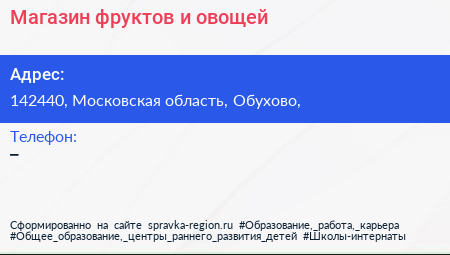 Магазин фруктов и овощей по адресу 142440, Московская область, Обухово, в дальнейшем Организация, размещена в следующих категориях: