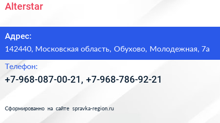 Alterstar по адресу 142440, Московская область, Обухово, Молодежная, 7а в дальнейшем Организация, размещена в следующих категориях: