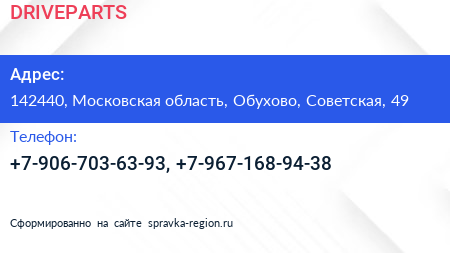 DRIVEPARTS по адресу 142440, Московская область, Обухово, Советская, 49 в дальнейшем Организация, размещена в следующих категориях: