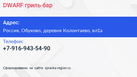 DWARF, гриль-бар по адресу Водяная мельница усадьбы Колонтаево, Напрудная улица, Колонтаево, Богородский городской округ, Московская область, Центральный федеральный округ, 142440, Россия в дальнейшем Организация, размещена в следующих категориях: