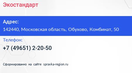 Экостандарт по адресу 142440, Московская область, Обухово, Комбинат, 50 в дальнейшем Организация, размещена в следующих категориях: