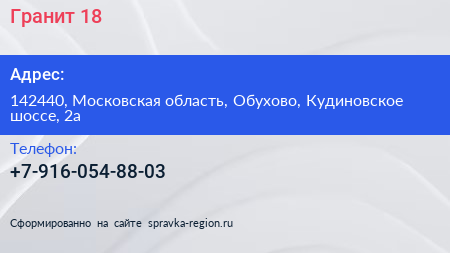Гранит 18 по адресу 142440, Московская область, Обухово, Кудиновское шоссе, 2а в дальнейшем Организация, размещена в следующих категориях: