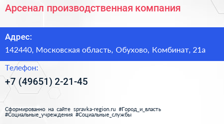 Арсенал, производственная компания по адресу 142440, Московская область, Обухово, Комбинат, 21а в дальнейшем Организация, размещена в следующих категориях: