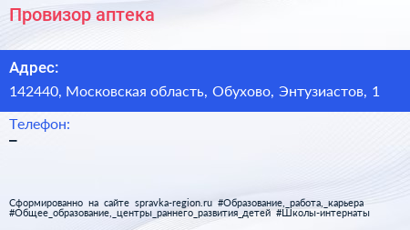 Провизор, аптека по адресу 142440, Московская область, Обухово, Энтузиастов, 1 в дальнейшем Организация, размещена в следующих категориях: