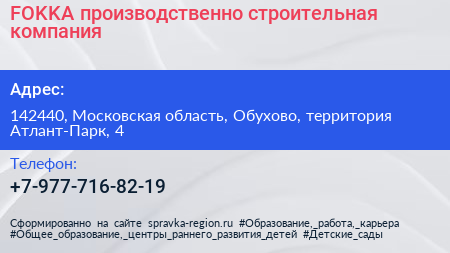 FOKKA, производственно-строительная компания по адресу 142440, Московская область, Обухово, территория Атлант-Парк, 4 в дальнейшем Организация, размещена в следующих категориях:
