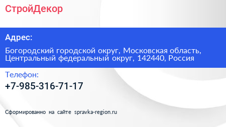 СтройДекор по адресу Богородский городской округ, Московская область, Центральный федеральный округ, 142440, Россия в дальнейшем Организация, размещена в следующих категориях: