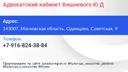 Адвокатский кабинет Вишневого Ю.Д. по адресу 143007, Московская область, Одинцово, Советская, 9 в дальнейшем Организация, размещена в следующих категориях: