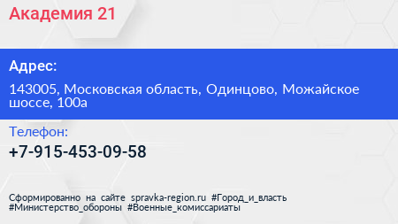 Академия 21 по адресу 143005, Московская область, Одинцово, Можайское шоссе, 100а в дальнейшем Организация, размещена в следующих категориях: