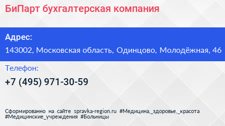 БиПарт, бухгалтерская компания по адресу 143002, Московская область, Одинцово, Молодёжная, 46 в дальнейшем Организация, размещена в следующих категориях: