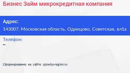 Бизнес Займ, микрокредитная компания по адресу 143007, Московская область, Одинцово, Советская, вл1а в дальнейшем Организация, размещена в следующих категориях:
