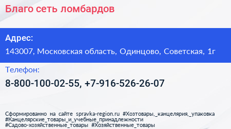 Благо, сеть ломбардов по адресу 143007, Московская область, Одинцово, Советская, 1г в дальнейшем Организация, размещена в следующих категориях: