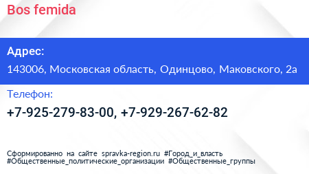 Bos-femida по адресу 143006, Московская область, Одинцово, Маковского, 2а в дальнейшем Организация, размещена в следующих категориях: