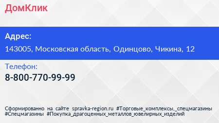 ДомКлик по адресу 143005, Московская область, Одинцово, Чикина, 12 в дальнейшем Организация, размещена в следующих категориях: