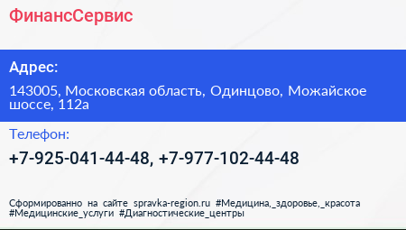 ФинансСервис по адресу 143005, Московская область, Одинцово, Можайское шоссе, 112а в дальнейшем Организация, размещена в следующих категориях: