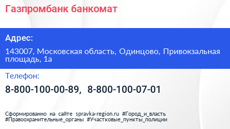 Газпромбанк, банкомат по адресу 143007, Московская область, Одинцово, Привокзальная площадь, 1а в дальнейшем Организация, размещена в следующих категориях: