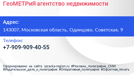 ГеоМЕТРиЯ, агентство недвижимости по адресу 143007, Московская область, Одинцово, Советская, 9 в дальнейшем Организация, размещена в следующих категориях: