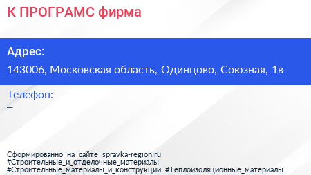 К-ПРОГРАМС, фирма по адресу 143006, Московская область, Одинцово, Союзная, 1в в дальнейшем Организация, размещена в следующих категориях: