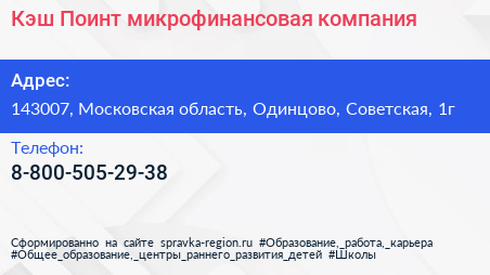 Кэш Поинт, микрофинансовая компания по адресу 143007, Московская область, Одинцово, Советская, 1г в дальнейшем Организация, размещена в следующих категориях: