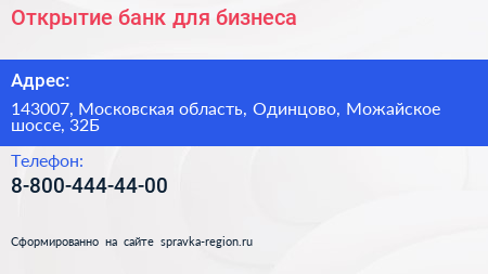 Открытие, банк для бизнеса по адресу 143007, Московская область, Одинцово, Можайское шоссе, 32Б в дальнейшем Организация, размещена в следующих категориях:
