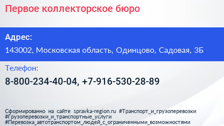 Первое коллекторское бюро по адресу 143002, Московская область, Одинцово, Садовая, 3Б в дальнейшем Организация, размещена в следующих категориях: