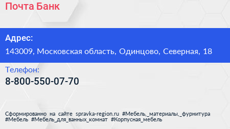 Почта Банк по адресу 143009, Московская область, Одинцово, Северная, 18 в дальнейшем Организация, размещена в следующих категориях: