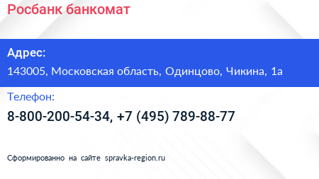 Росбанк, банкомат по адресу 143005, Московская область, Одинцово, Чикина, 1а в дальнейшем Организация, размещена в следующих категориях: