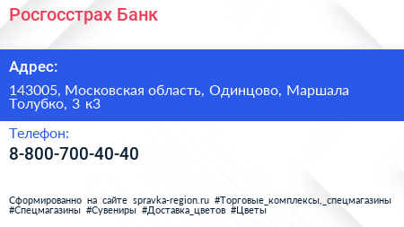 Росгосстрах Банк по адресу 143005, Московская область, Одинцово, Маршала Толубко, 3 к3 в дальнейшем Организация, размещена в следующих категориях: