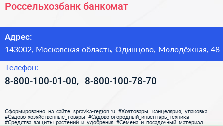 Россельхозбанк, банкомат по адресу 143002, Московская область, Одинцово, Молодёжная, 48 в дальнейшем Организация, размещена в следующих категориях: