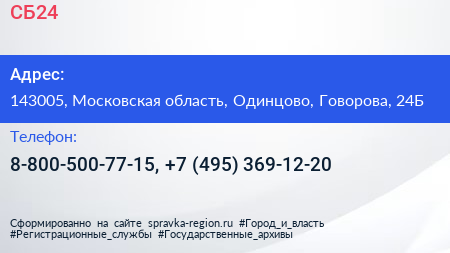 СБ24 по адресу 143005, Московская область, Одинцово, Говорова, 24Б в дальнейшем Организация, размещена в следующих категориях: