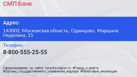 СМП Банк по адресу 143002, Московская область, Одинцово, Маршала Неделина, 15 в дальнейшем Организация, размещена в следующих категориях: