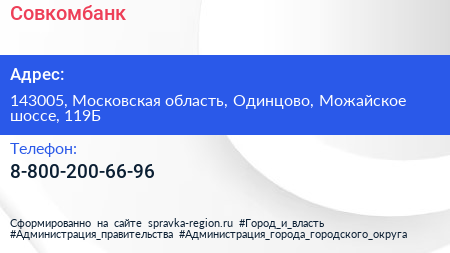 Совкомбанк по адресу 143005, Московская область, Одинцово, Можайское шоссе, 119Б в дальнейшем Организация, размещена в следующих категориях: