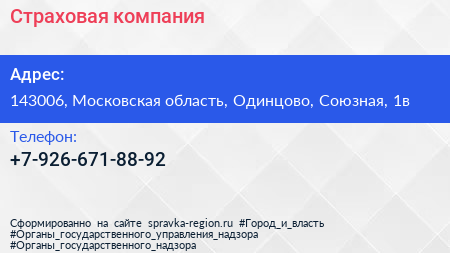 Страховая компания по адресу 143006, Московская область, Одинцово, Союзная, 1в в дальнейшем Организация, размещена в следующих категориях: