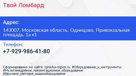 Твой Ломбард по адресу 143007, Московская область, Одинцово, Привокзальная площадь, 1а к1 в дальнейшем Организация, размещена в следующих категориях: