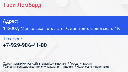 Твой Ломбард по адресу 143007, Московская область, Одинцово, Советская, 1Б в дальнейшем Организация, размещена в следующих категориях: