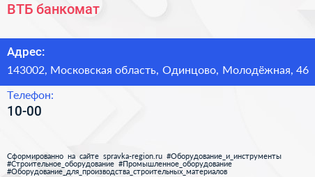 ВТБ, банкомат по адресу 143002, Московская область, Одинцово, Молодёжная, 46 в дальнейшем Организация, размещена в следующих категориях: