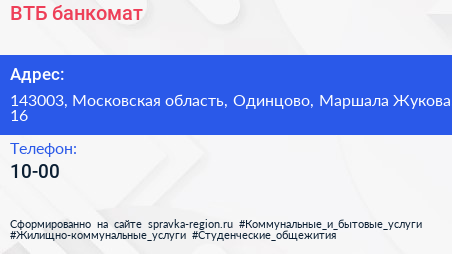 ВТБ, банкомат по адресу 143003, Московская область, Одинцово, Маршала Жукова, 16 в дальнейшем Организация, размещена в следующих категориях: