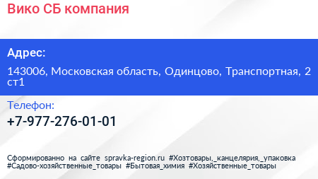 Вико-СБ, компания по адресу 143006, Московская область, Одинцово, Транспортная, 2 ст1 в дальнейшем Организация, размещена в следующих категориях: